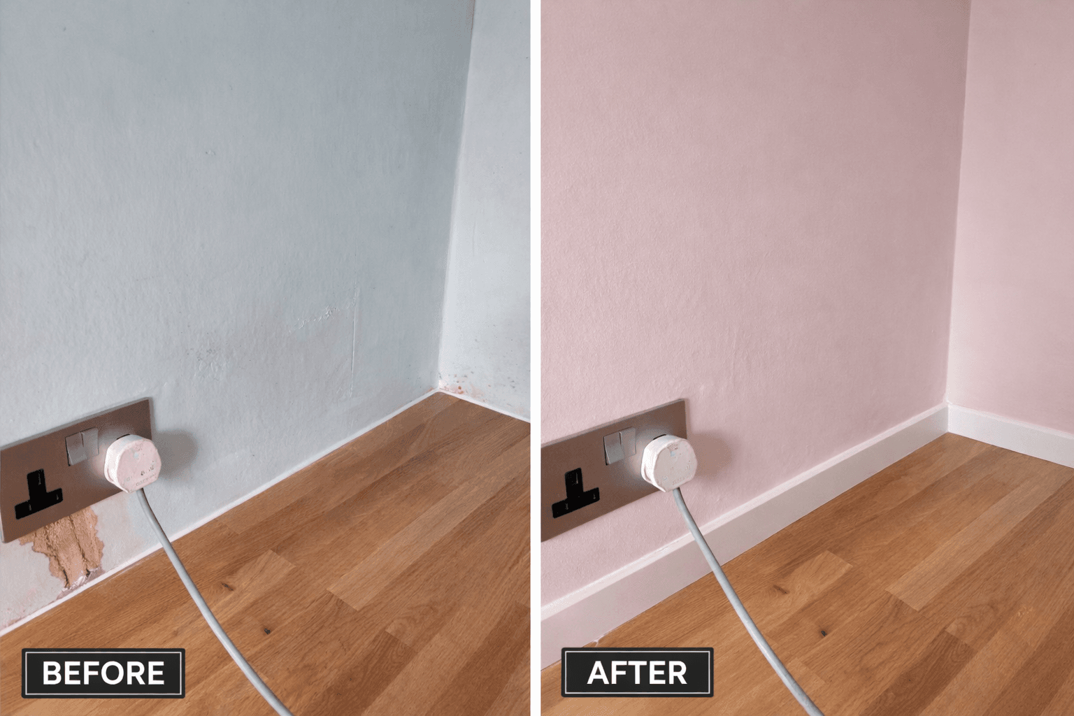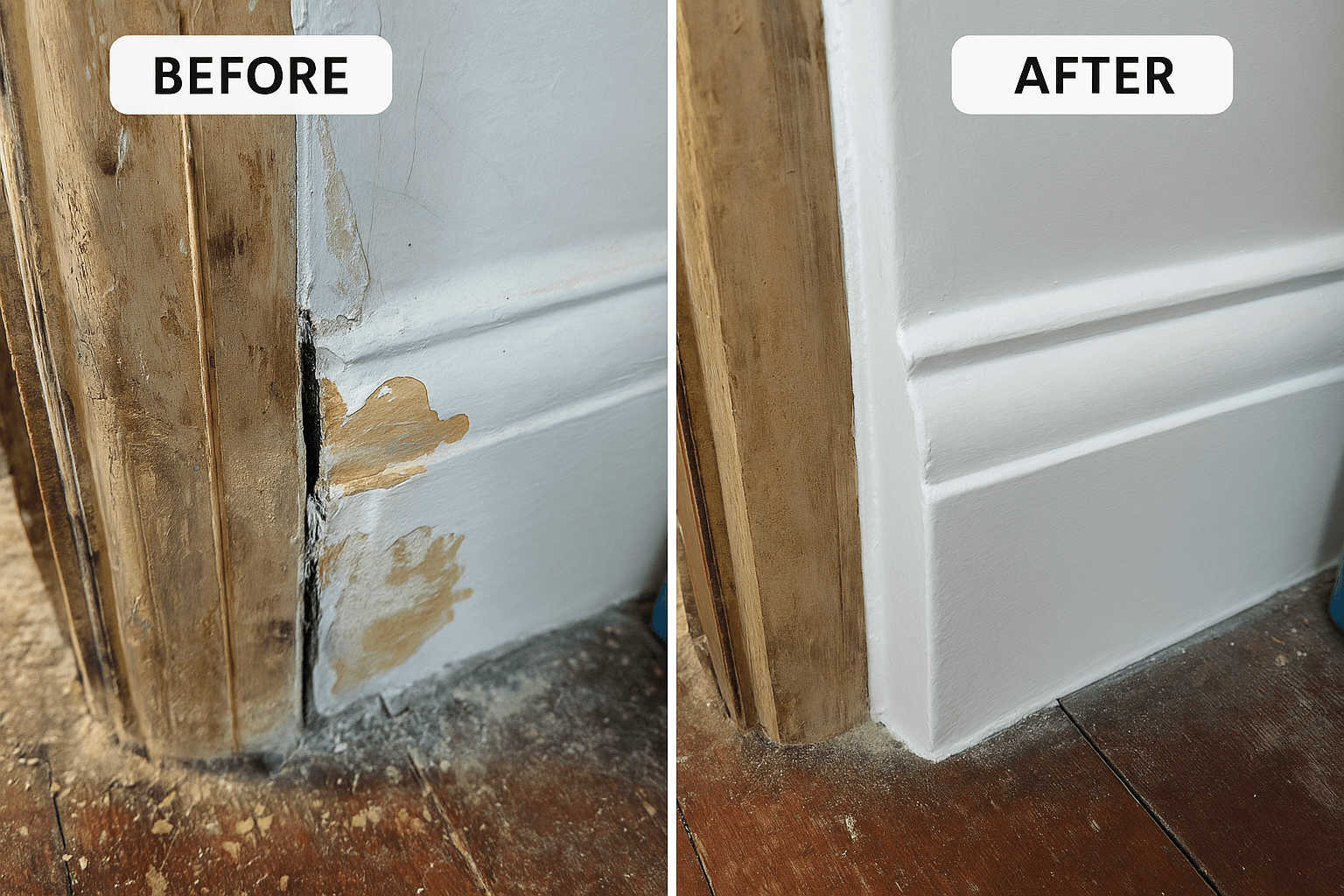 This section shows examples of door and skirting board preparation, repair and repainting. Work includes sanding, filling damaged edges, restoring worn frames, and applying clean, even finishes to woodwork. Proper preparation and sharp detailing ensure a tidy result that complements the overall room repaint.