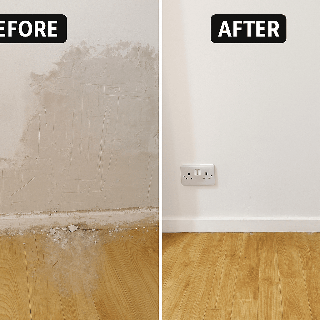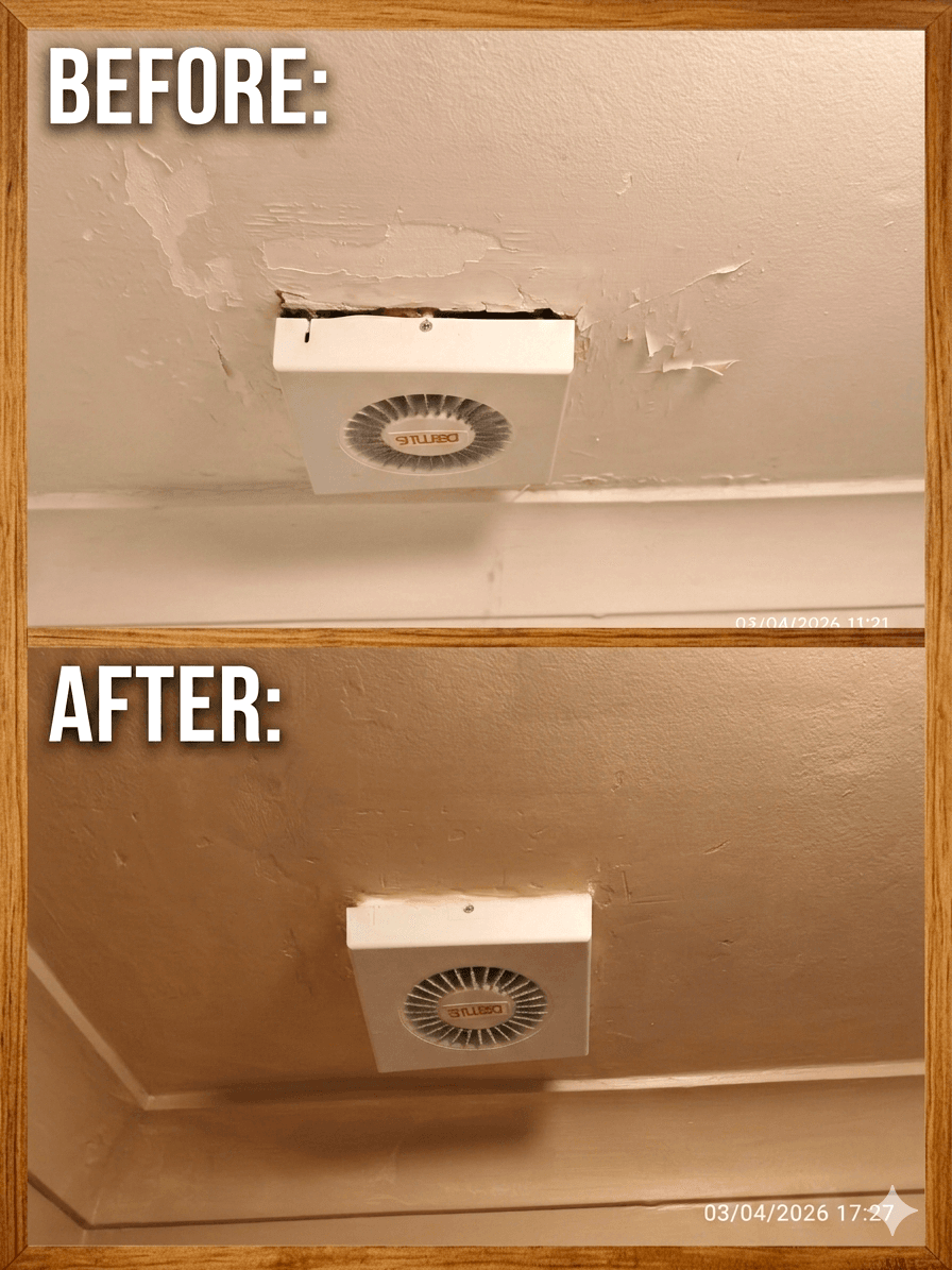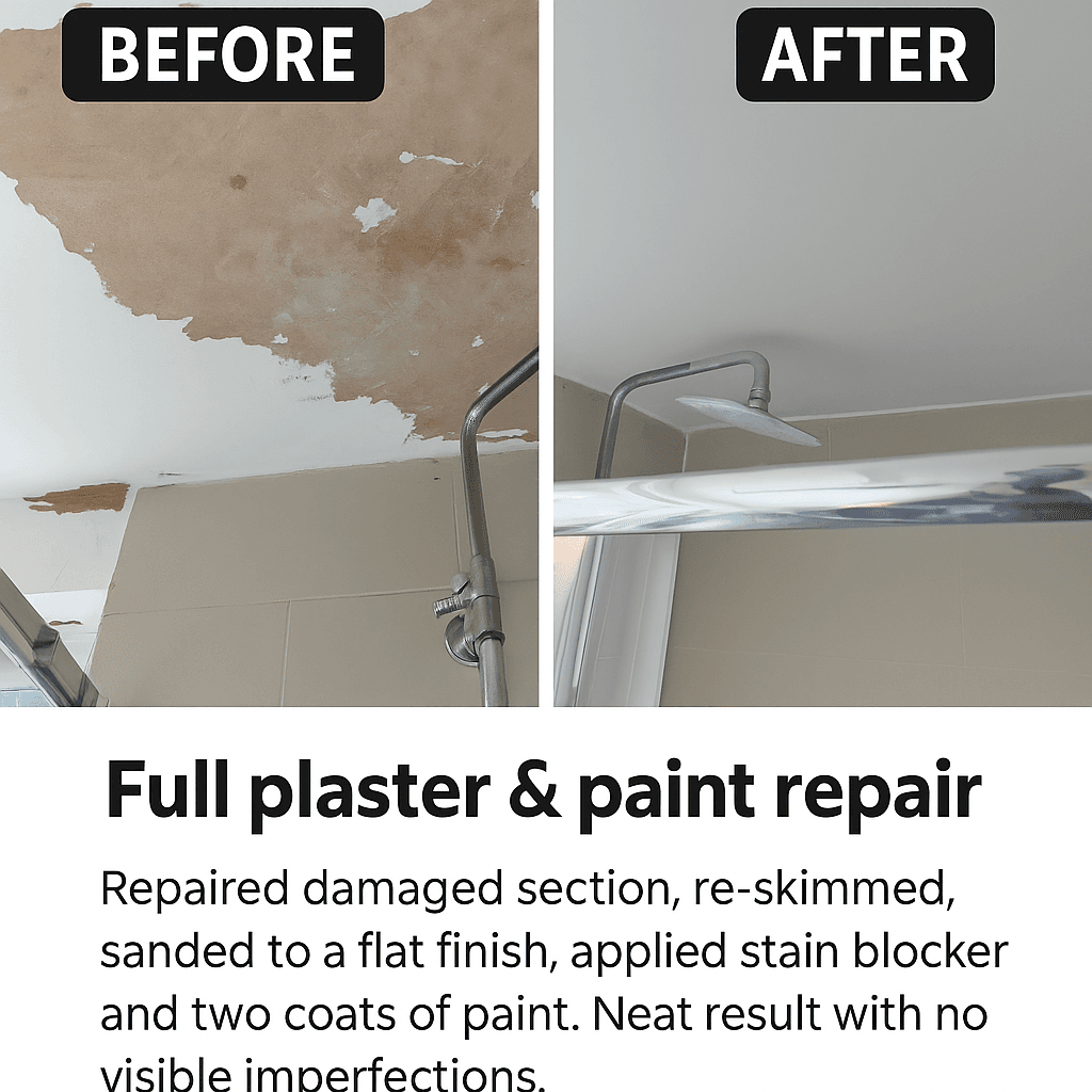 This section showcases professional wall and ceiling repairs, plaster restoration, and comprehensive bathroom touch-ups completed across London properties. My work specializes in restoring surfaces to their original condition, including repairing water-damaged plaster, re-skimming affected areas, and restoring damaged corners or woodwork.